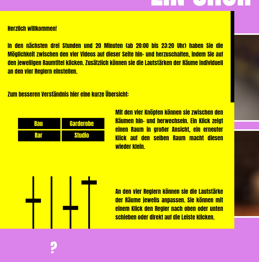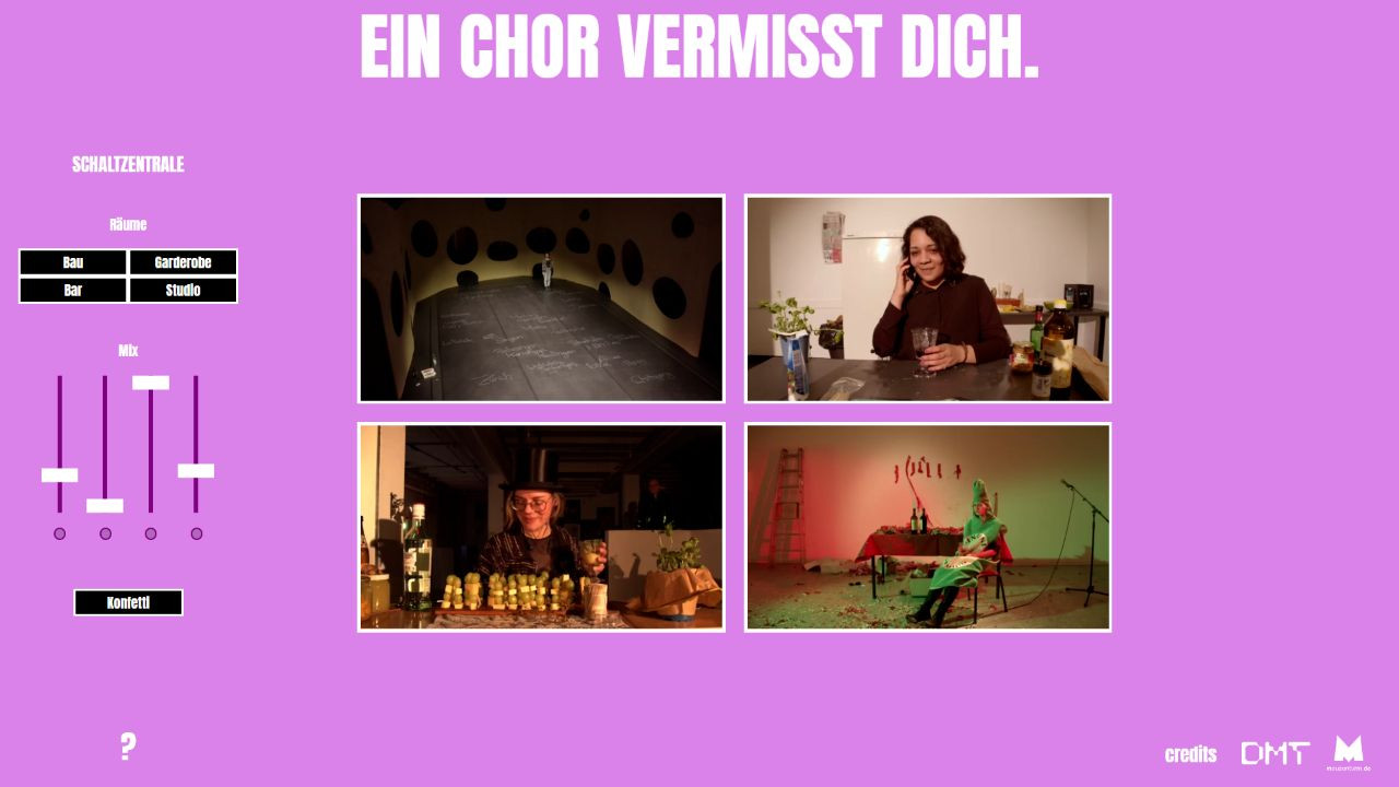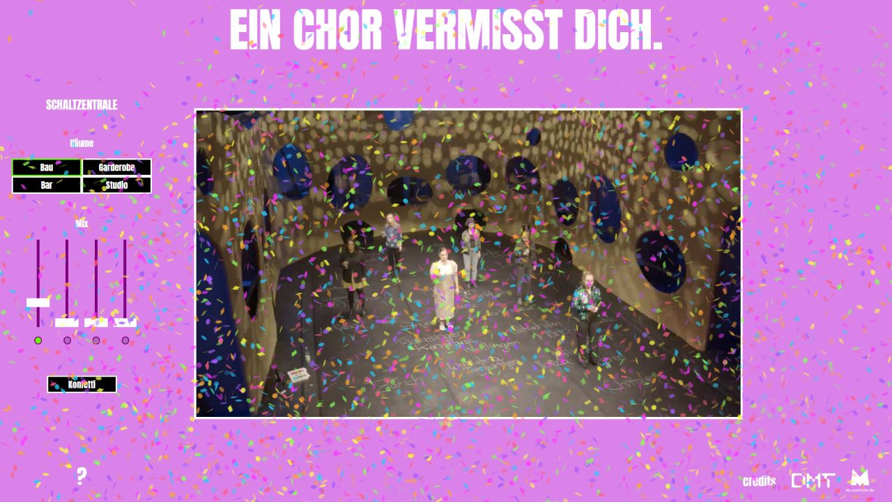 Gemeinsam mit dem Zaungäste Kollektiv und dem Mousonturm Frankfurt entstand ein interaktiver digitaler Bühnenraum, der Zuschauer:innen dazu einlud, fließend zwischen vier Räumen zu wechseln oder allen Solo-Performances des Chors gleichzeitig zuzuschauen und zu hören. Dabei konnte spielerisch erkundet werden, welche klanglichen Überlagerungen der einzelnen Soloparties am besten zueinander passen und selbstverständlich gab es auch Konfetti.