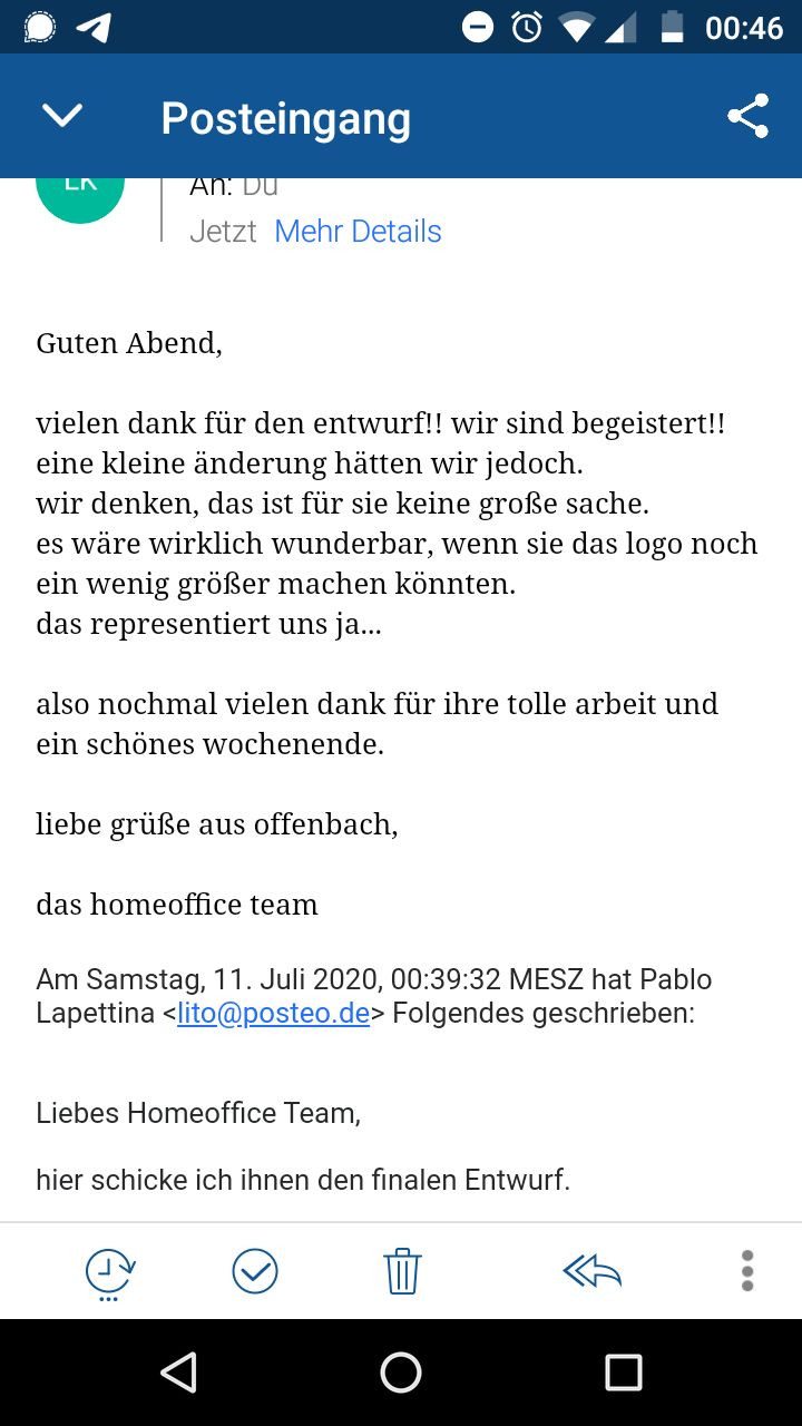 Das halböffentliche Recherchefestival How To Work?* des Studios für Experimentelles Design der HFBK Hamburg fand mit dieser musikalisch-performativen Einlage zwischen zwei Städten seinen Abschluss. Aus Frankfurt kam Musik von The Homeoffice Channel (passend zur Beschäftigung mit Arbeitsbedingungen in den Künsten und der Gestaltung während des Festivals), während in Hamburg für den Klienten Homeoffice Channel allmählich eine digitale Bühne entstand. Die Arbeitsbedingungen von Gestalter:innen wurde dabei einerseits im Auftraggeber:innen-Gestalter:innen-Verhältnis sowie in der Auswahl des Materials, welches einem früheren "Brotjob" entstammt, persifliert. Musikalische und gestalterische Performance gingen hierbei ineinander über und kulminierten in der Forderung, letztlich doch noch das Logo zu vergrößern.