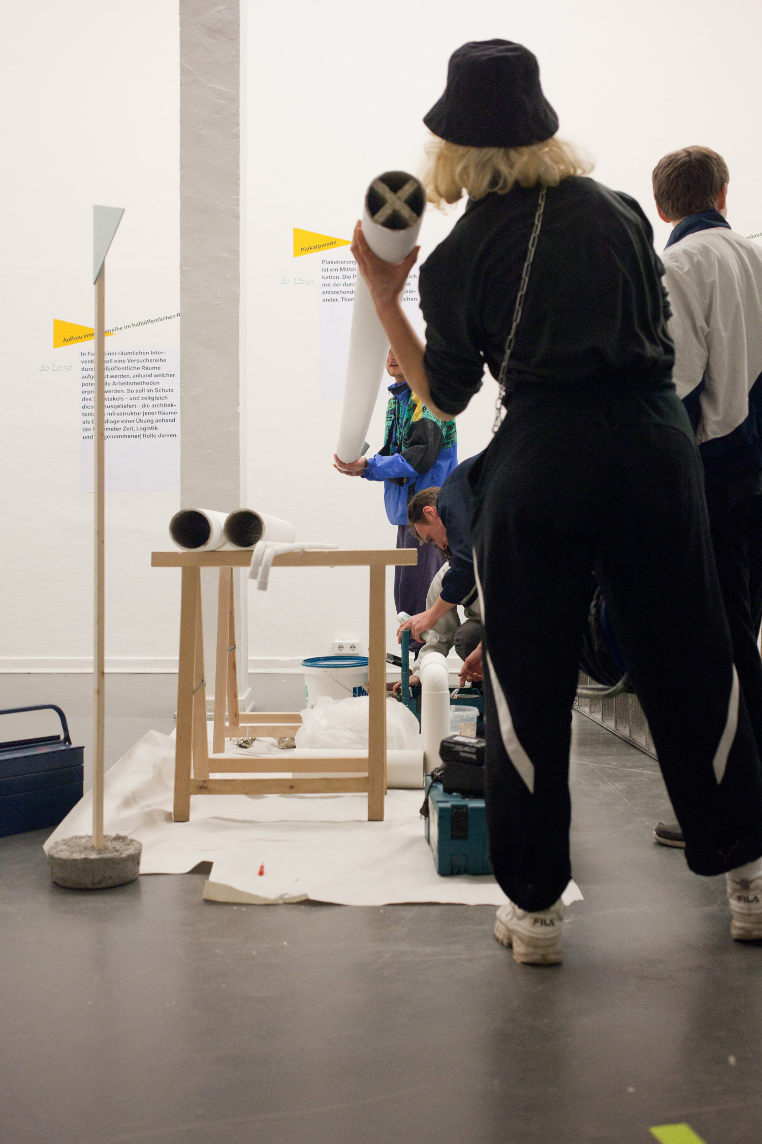 In Form einer räumlichen Intervention soll eine Versuchsreihe durch halböffentliche Räume aufgebaut werden, anhand welcher potentielle Arbeitsmethoden einer Gruppierung erprobt werden. So soll im Schutz des Spektakels - und zeitgleich diesem als Betrachter ausgeliefert - die architektonische Infrastruktur jener Räume als Grundlage einer Übung anhand der Parameter Zeit, Logistik und (angenommener) Identität dienen.