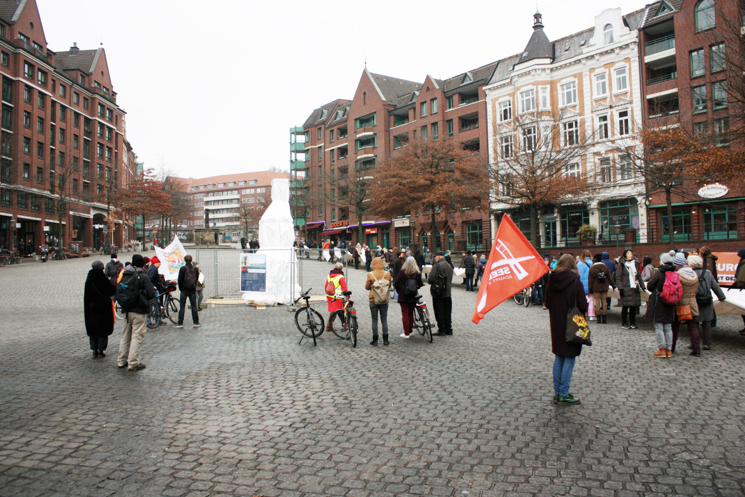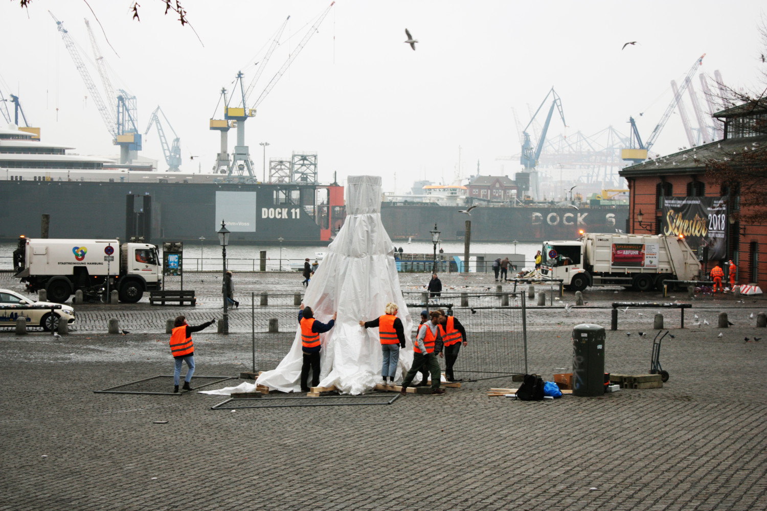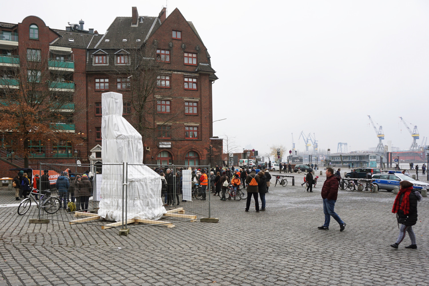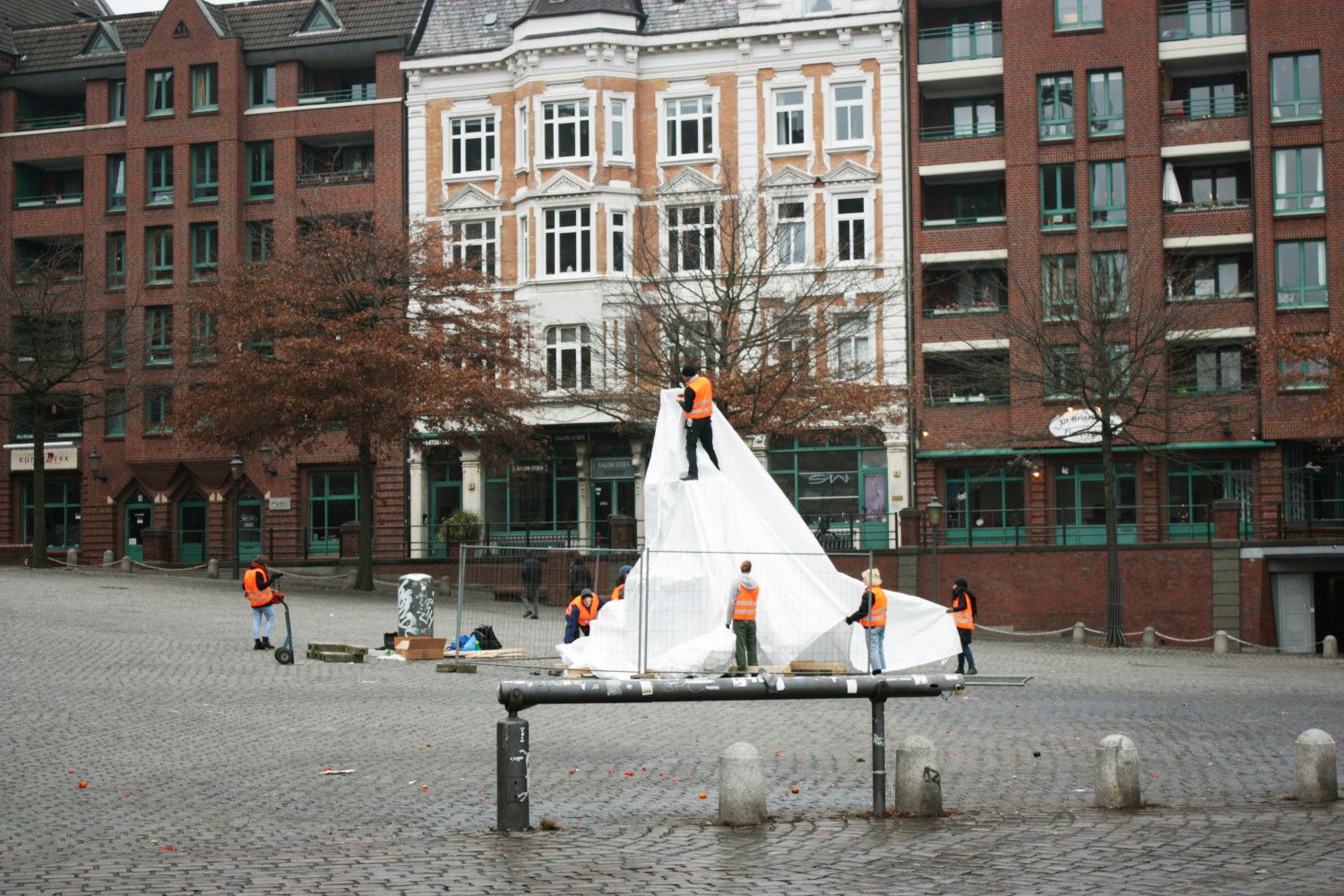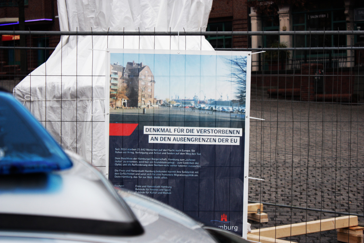 Wir entschieden uns dagegen, ein Denkmal zu errichten, da dieses im klassischen Sinne einen abgeschlossenen Prozess suggeriert. Diese Form ist angesichts des bis heute anhaltenden Sterbens unangemessen. Daher nahmen wir die Identität der Stadt Hamburg an und stellten im Namen dieser ein verhülltes Objekt auf, das als Baustelle eines zukünftigen Denkmals gekennzeichnet war.